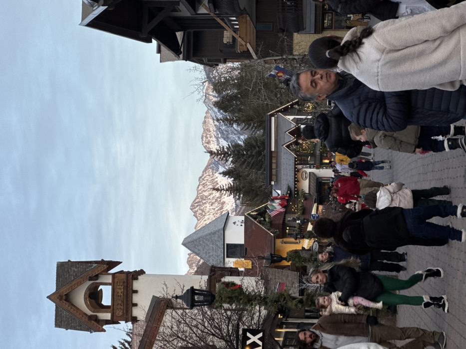 A scenic mountain town scene with numerous people walking along a brick-paved street. Buildings with unique architecture frame the sides, some adorned with Christmas decorations. Snow-capped mountains rise in the background under a cloudy sky. The perspective is rotated slightly, offering an interesting view of the bustling town amidst the natural landscape.