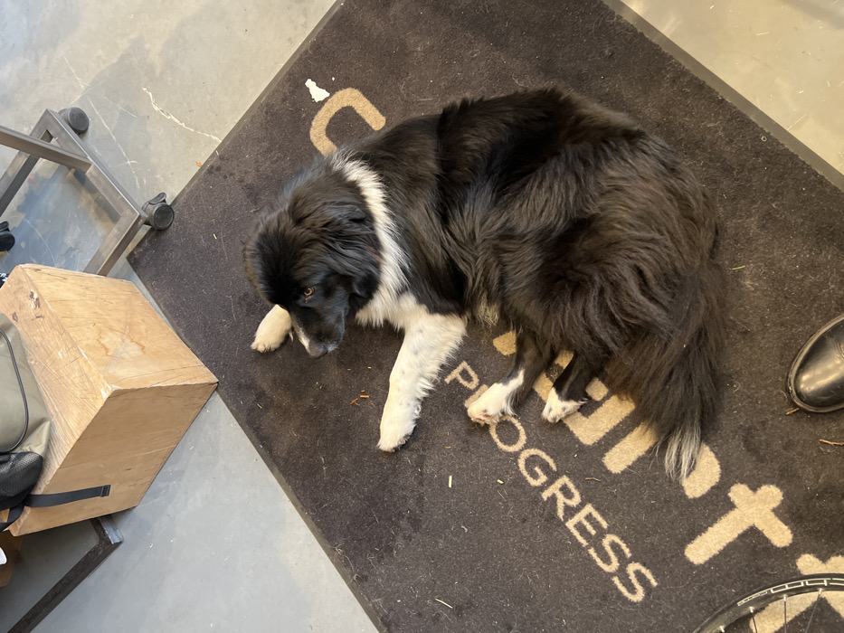A large, long-haired black and white dog is depicted lying on a dark grey floor mat in an indoor setting in Uccle - Ukkel, Belgium. The dog, exhibiting white paws, a prominent white stripe across its chest, and a white-tipped tail, rests on its left side. Its head is turned slightly to the left, with its gaze directed towards the left side of the frame. The mat features partially inverted, light-colored lettering spelling "PROGRESS" and a stylized logo, along with scattered small debris. The surrounding floor is light grey concrete. In the upper-left quadrant, a rough-hewn wooden block supports a green canvas bag with black straps. A metal stand on wheels is partially visible in the upper-right. A segment of a bicycle wheel is present in the lower-left. A human foot, wearing a dark leather shoe, is positioned at the lower-center, partially on the mat, adjacent to the dog's tail.