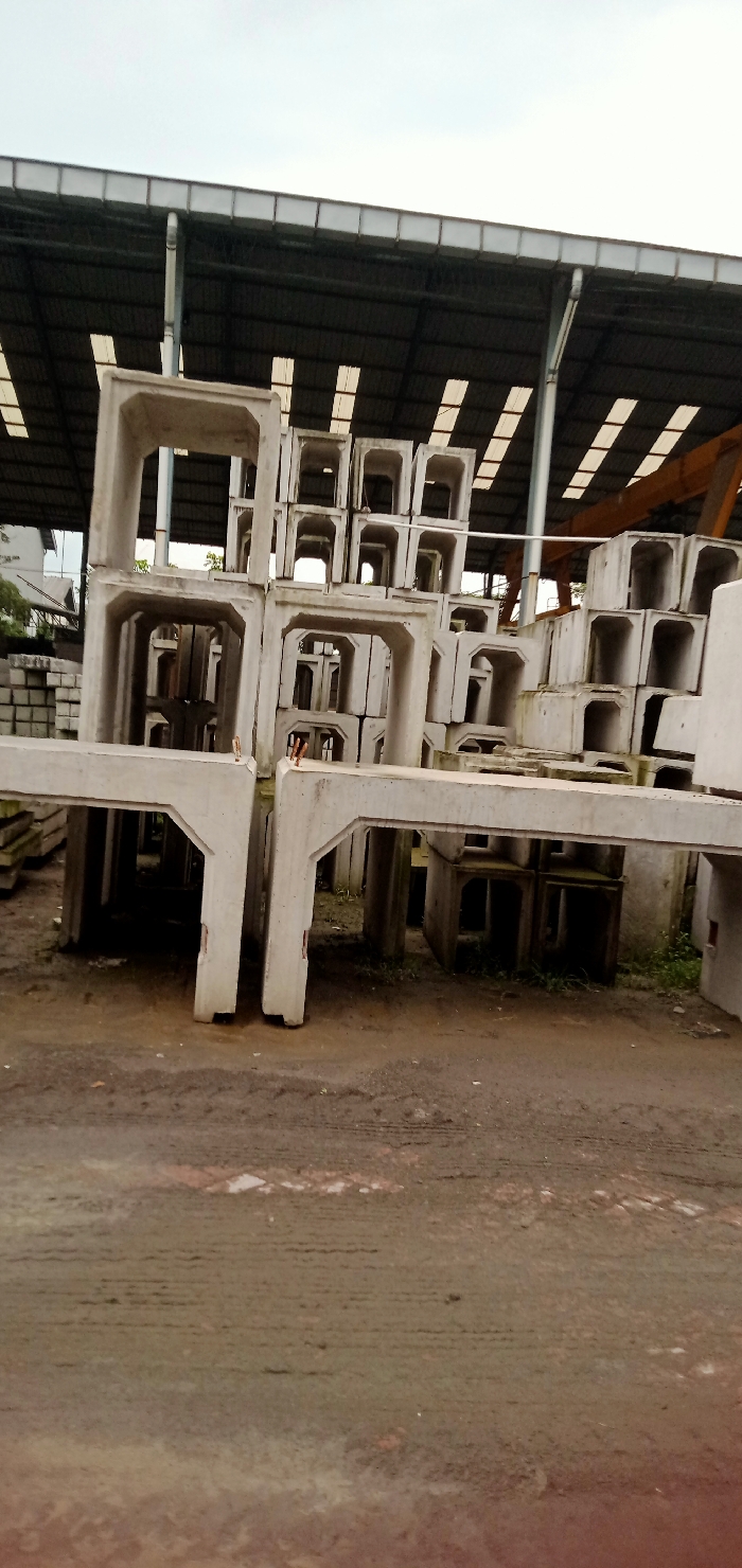 The image displays an outdoor industrial storage area located in Sumput, Indonesia. The scene is dominated by numerous light grey precast concrete components under an overcast sky. In the immediate foreground, the ground is unpaved, consisting of reddish-brown dirt with visible tire tracks and minor puddling. Two vertically oriented light grey precast concrete T-beams, showing exposed rebar at their upper ends, are positioned centrally. Behind these, extensive stacks of light grey precast concrete culvert sections, primarily U-shaped and box-shaped, are arranged in varied configurations, forming multiple tiers. Further back, additional stacks of concrete blocks or components are visible. The background features a large industrial building with a dark, corrugated metal roof, supported by metal girders and columns. A metallic structural pole ascends towards the roof structure in the mid-left. A section of an orange industrial beam is partially visible on the far right, beneath the roofline. No individuals or active operations are depicted within the frame.