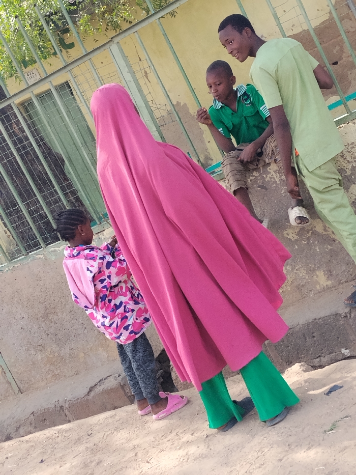 The image depicts four individuals in an outdoor setting in Gama, Nigeria, specifically near a location marked "432 / GAMA 2." In the foreground, a person, facing away from the camera, wears a full-body bright pink garment over green trousers and dark sandals. To their immediate left and slightly in front, a young girl with braided hair, wearing a pink and white camouflage-patterned jacket, grey leggings, and pink sandals, is oriented towards the pink-clad individual. In the background, two males are positioned against a weathered light yellow wall behind a green metal fence. A young boy in a green collared shirt and patterned brown shorts sits on a low concrete ledge, with his right hand near his mouth, looking towards the pink-clad figure. Standing to his right is a young man in a light green tunic and matching trousers, wearing white slip-on sandals on his visible left foot, smiling and also looking towards the pink-clad figure. Green foliage is visible behind the metal fence. The ground is unpaved, light brown earth. The scene is brightly lit by natural light.