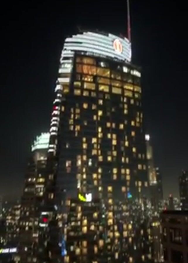 night view of a cityscape with a tall, brightly lit skyscraper as the focal point. The building has a unique design with an offset top and a prominent logo. Its many windows glow with interior lights. Around it are other buildings of varying heights, also illuminated, creating a dense urban landscape. At the base of the main building, there's an area that appears to be an outdoor venue or plaza with bright screens or signs and possibly a swimming pool. The night sky is dark, providing a stark contrast to the bright cityscape. The camera gradually tilts downwards, emphasizing the height and scope of the buildings.