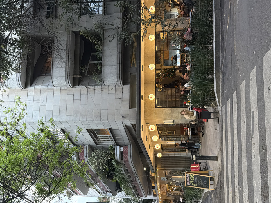 An exterior shot shows a tall, ornate building next to an open-front restaurant. The building's architecture features curved details and stone facade. The restaurant, illuminated by round lights, has a bustling patio with people dining. A crosswalk is visible in the foreground, leading to the restaurant. A chalkboard sign advertises pizza and beer. Trees add greenery to the urban scene.