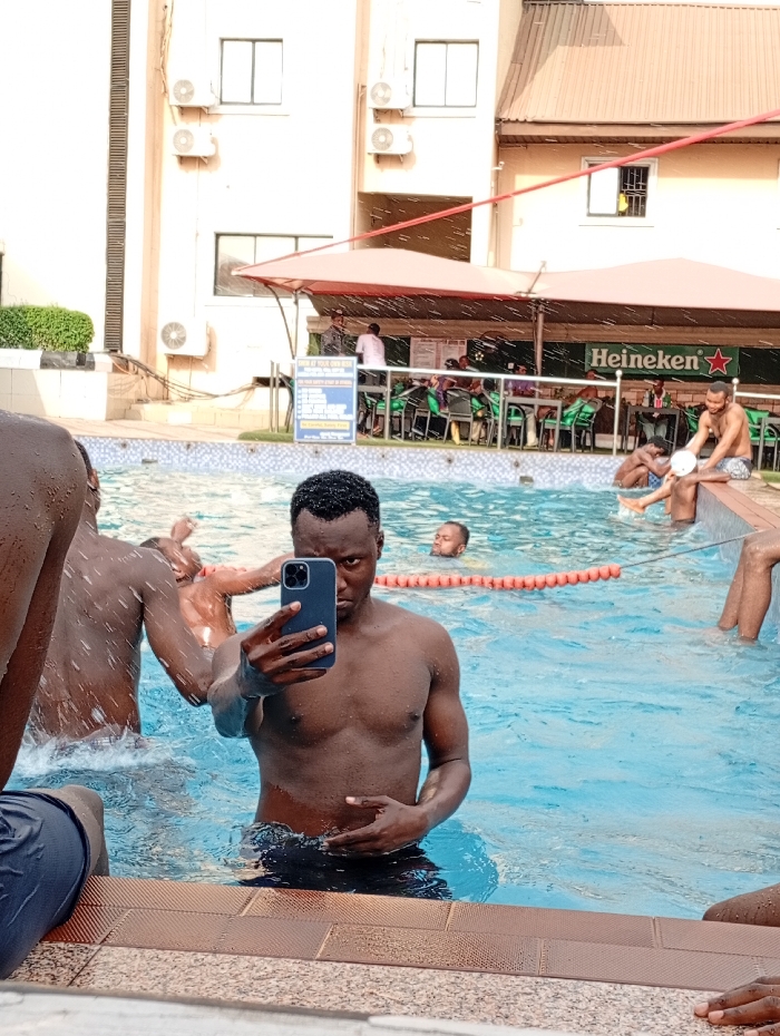 A group of shirtless men are enjoying a swimming pool. One man stands in the foreground, holding up a smartphone, seemingly taking a selfie. Behind him, other men are splashing around and playing in the water. Further back, there is a covered bar area with chairs, tables, and a Heineken sign. The scene is set outdoors with a building and trees visible in the background. The atmosphere is relaxed and jovial.