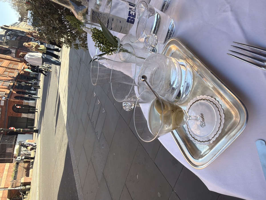 The scene depicts an outdoor dining arrangement on a paved sidewalk in London, specifically on Duke's Walk, indicated by a visible street sign