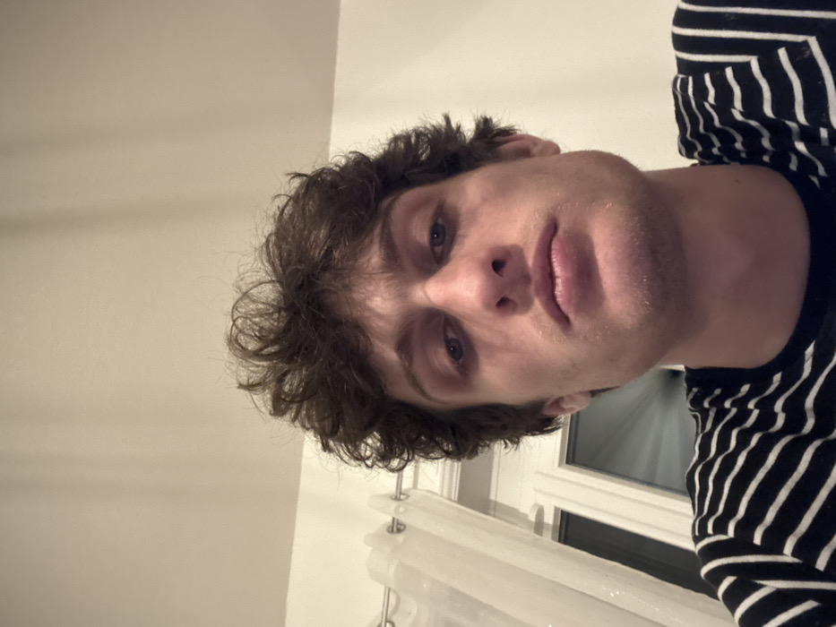 The scene depicts a close-up portrait of a single male individual. The subject appears to be a young adult with dark, curly hair and blue eyes. He has a neutral to serious expression, with visible stubble on his chin and upper lip. He is wearing a dark-colored t-shirt with thin horizontal white stripes. The image is framed from slightly below, looking upwards. The background indicates an indoor domestic setting. A plain, light-colored wall or ceiling occupies the upper portion of the frame. To the viewer's left, a segment of a white-framed window is visible, partially obscured by a sheer white curtain. The curtain is suspended from a metallic rod with rings. Artificial overhead lighting is suggested by the shadows and overall illumination. No identifying features specific to a city are present within the visual content of the image. The location is an indoor domestic setting in the city of Roanne, France.