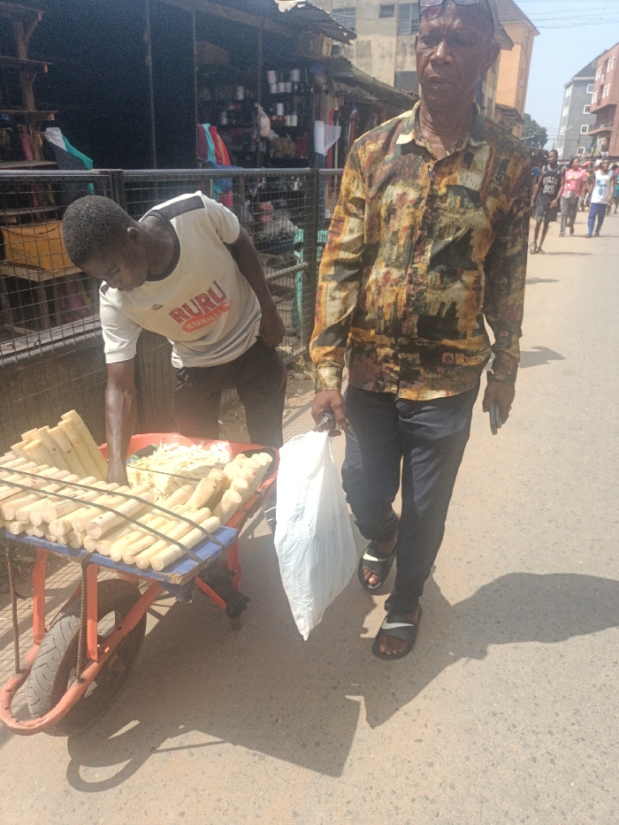 This image captures an outdoor street scene in Unguwar Kaya, Nigeria, under clear daylight conditions, indicated by strong shadows. In the foreground, a young adult male is positioned on the left, bent over a red and blue pushcart. He wears a light-colored t-shirt with a dark collar and "RURU MARHALLA" printed on the chest, along with dark trousers. His right arm is extended towards the contents of the cart, which include numerous peeled sugarcane sticks arranged horizontally and vertically, alongside a pile of shredded white food items. To the right, an older adult male walks forward. He wears sunglasses pushed onto his head, a long-sleeved collared shirt with a multi-colored abstract pattern (greens, yellows, browns), dark trousers, and dark slide sandals with a white Nike logo. He carries a white plastic bag in his left hand and a dark-colored smartphone in his right hand. His gaze is directed slightly to the left. The background reveals a paved street with additional blurred figures walking further down. Structures consistent with street-side shops, featuring open fronts displaying merchandise and corrugated metal roofs, are visible behind a dark metal fence on the left side of the frame.