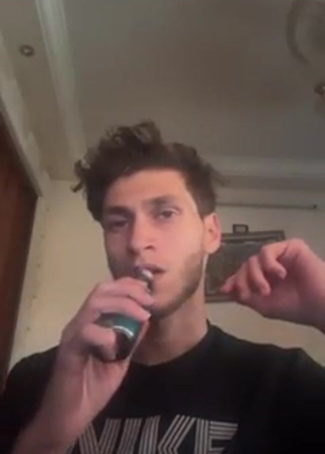 A young man with brown, wavy hair and light stubble is centered in the frame