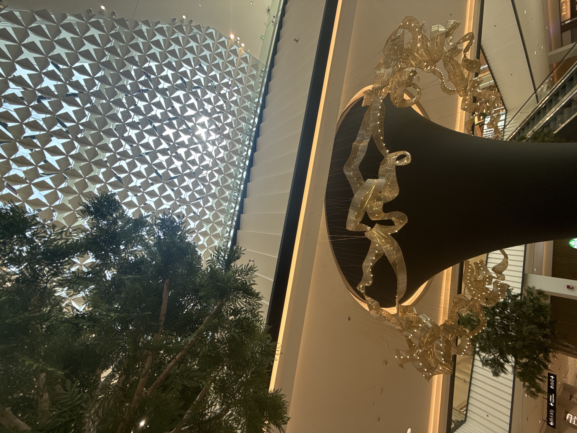 The image displays the interior of a multi-level modern commercial building, identified as being in Al Jimi, United Arab Emirates. The perspective is upward-looking, capturing architectural and decorative elements. A dominant feature is the ceiling, which incorporates a large, light-colored, tessellated skylight composed of numerous diamond or square-shaped panels, allowing diffused natural light to enter. A substantial green tree, with dense foliage and visible branches, occupies the upper left quadrant, extending into the mid-ground. Below the skylight, a large, dark, inverted conical or cylindrical pillar serves as a central structural element. Suspended around the upper section of this pillar is an elaborate artistic chandelier-like installation. This piece consists of interwoven, undulating golden metallic mesh ribbons embedded with numerous small, illuminated lights, creating an organic, flowing form. Further below, multiple levels of the building are visible, characterized by light-colored walls and ceilings. A pair of escalators with glass balustrades is partially visible on the right side, ascending to an upper floor. Recessed lighting is present in the ceilings of the lower levels. In the lower left, a black directional sign with white pictograms and text in Arabic and English is partially visible. No individuals or direct interactions are depicted in the scene.