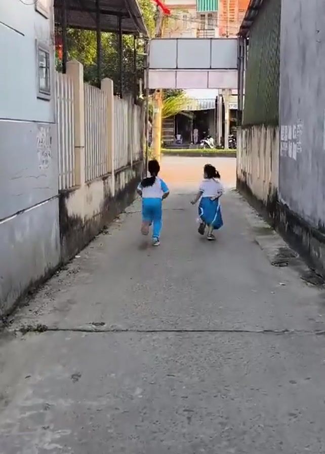 Two young girls, dressed in blue and white uniforms, run away from the camera down a narrow concrete alleyway