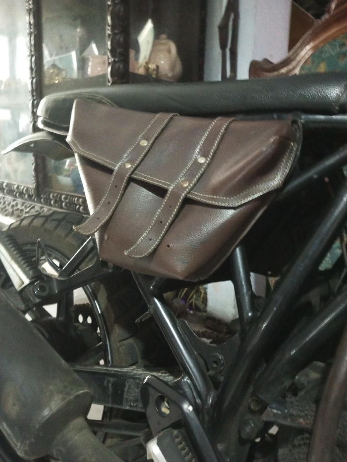 A brown leather saddlebag is attached to a black motorcycle frame behind the seat