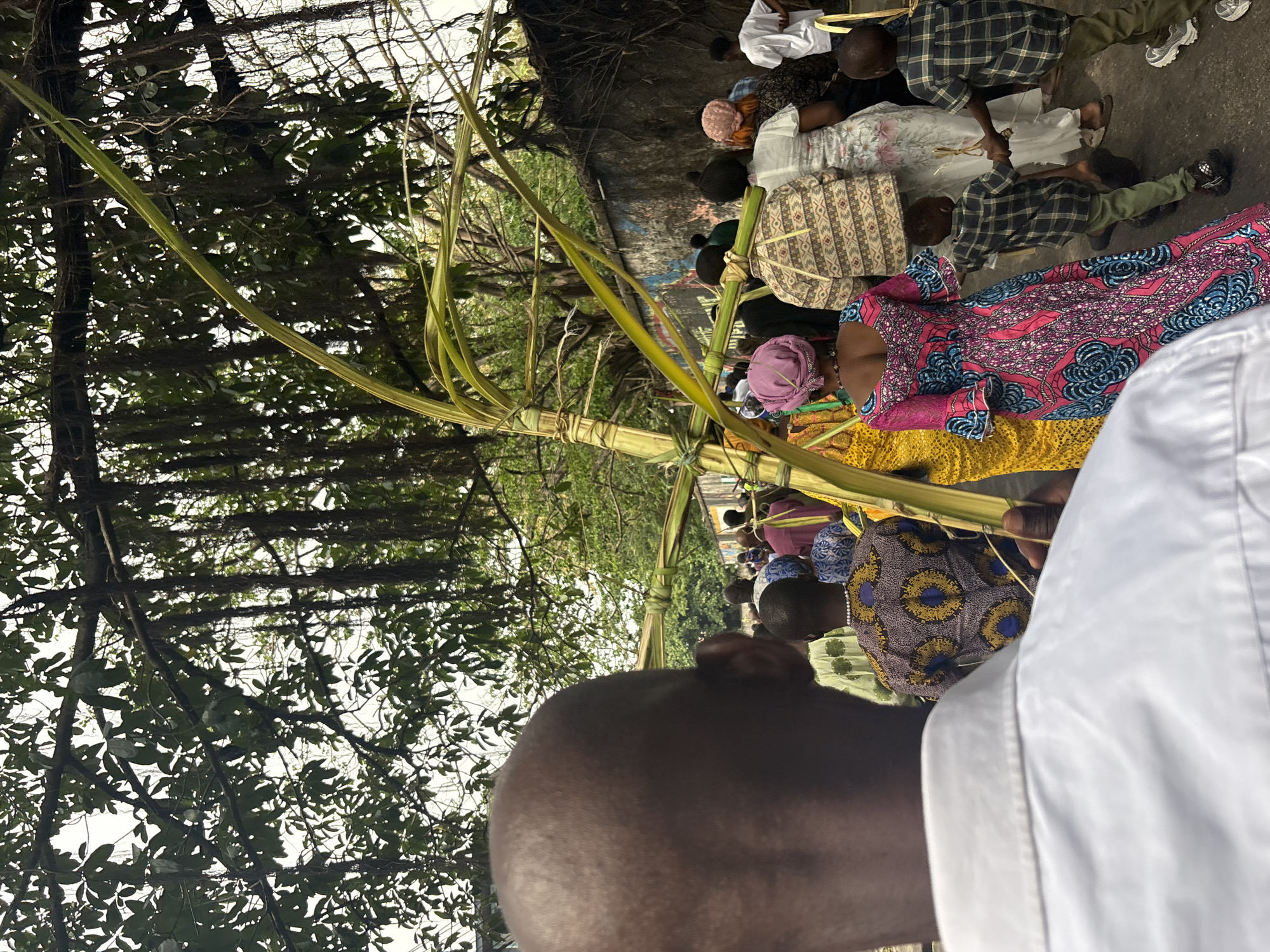 A low-angle, eye-level shot depicts a group of people processing along a path in Lagos, Nigeria. The foreground is dominated by the back of a dark-skinned person's head and shoulders, covered in a white garment. To the left and above, trees form a canopy, their branches and leaves creating a shaded area. The path leads into a brighter, more open space where a crowd of individuals is visible. Many are holding tall, green palm fronds, some of which are tied together with natural fibers. People in the crowd wear a variety of clothing, including patterned fabrics and checkered shirts. The background shows a concrete wall or building and glimpses of the sky.