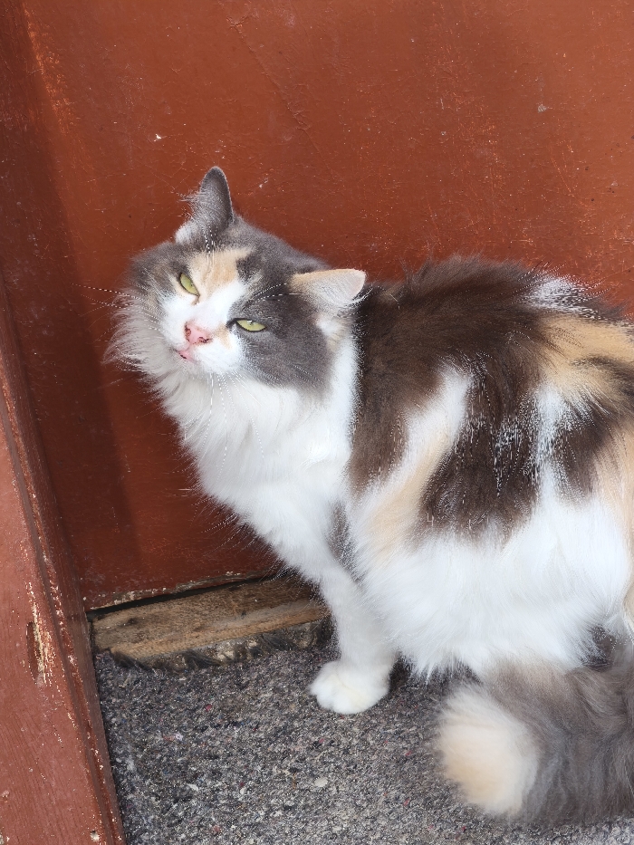 - "A domestic long-haired cat, exhibiting a dilute calico coat with white, grey-brown, and cream patches, is depicted in a seated posture" by FM-r4Hhz2, licensed under CC BY 4.0