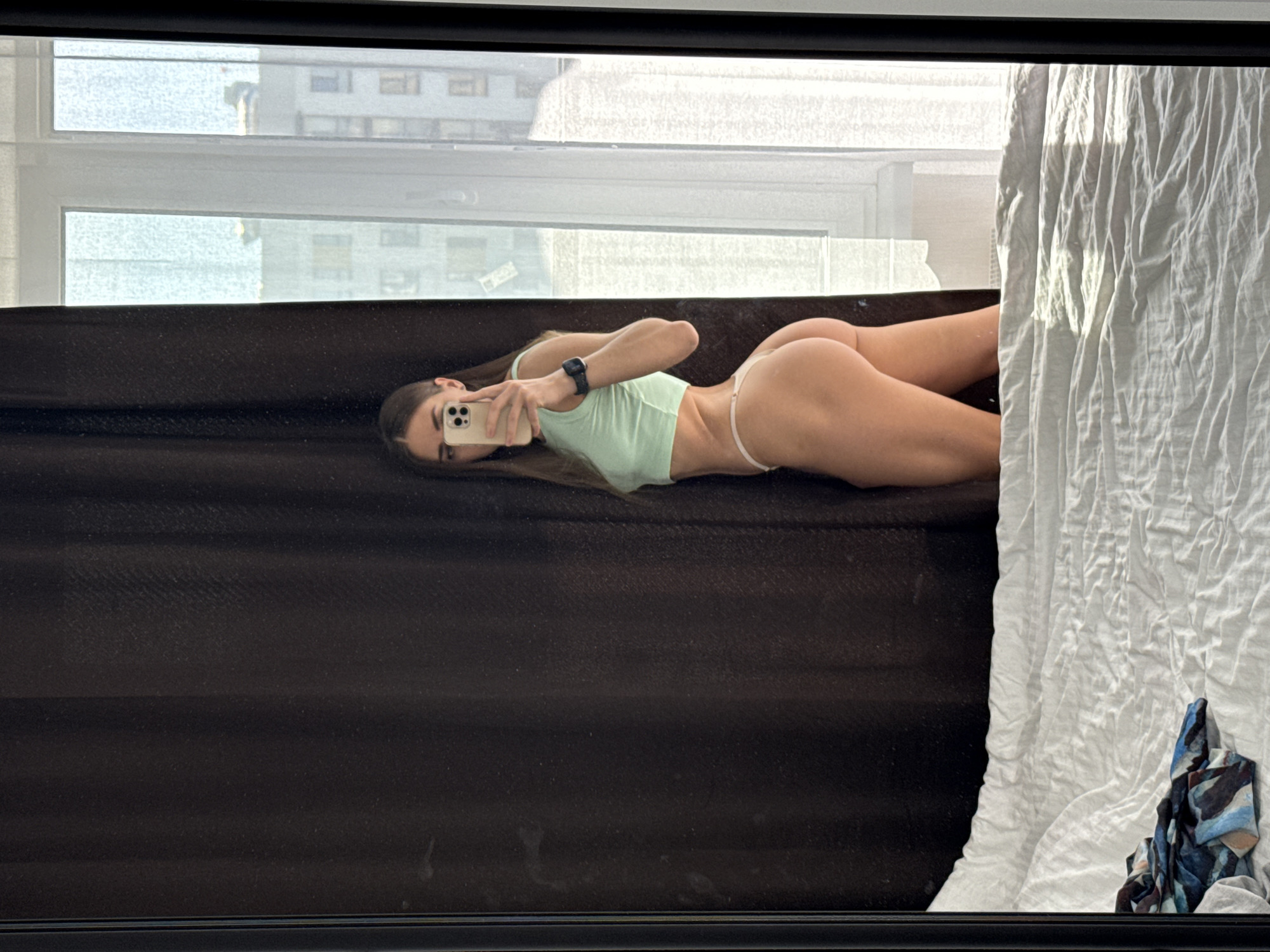 A reflective indoor shot shows a woman, possibly in a mirror, lying on her side. She is fair-skinned and has long brown hair and is wearing a light green top and a thin white bottom. She is holding a phone, taking a picture of herself. The background displays a high-rise urban scene visible through a window, with white buildings. The location is the city of Lyubertsy, Russia. Beside her is a crumpled white bed sheet with a blue garment on it.