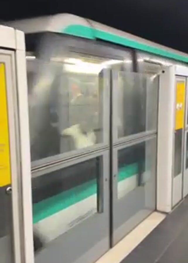 doors of a subway train opening at a station. The doors are glass and metal, and they slide open horizontally. The train is visible through the doors, and people can be seen inside. The station platform is tiled, and there are signs and safety barriers in place. The overall environment is clean and modern.
