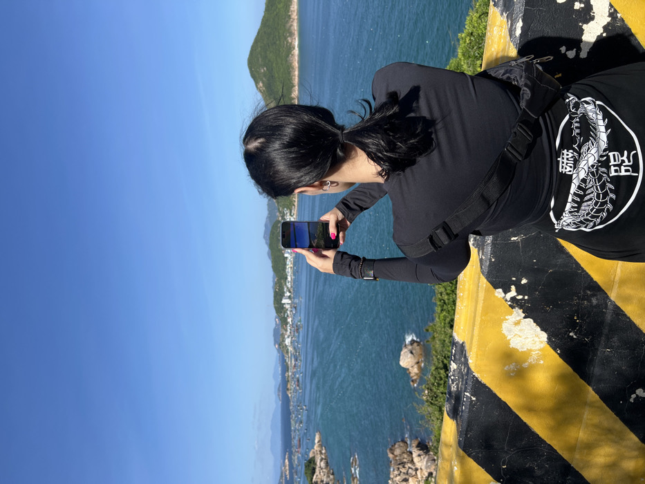 A woman in black clothing takes a picture with her smartphone of a coastal view. She stands on a yellow and black striped barrier. The scene includes a deep blue ocean, rocky islands, and a distant shoreline with buildings. The woman has black hair pulled back, and a bag slung over her shoulder. The back of her shirt or pants features a white design with a centipede and Asian characters.
