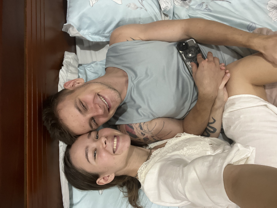 - "A high-angle photograph depicts two young adults, a female and a male, smiling directly at the camera while lying side-by-side on a bed in Nha Trang, Vietnam" by FM-U93nI3, licensed under CC BY 4.0