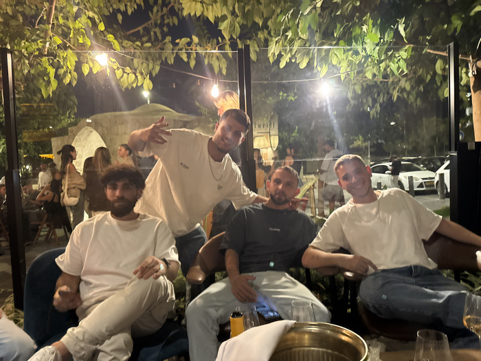 The image depicts four adult males at an outdoor dining establishment in Jerusalem, Israel, during nighttime