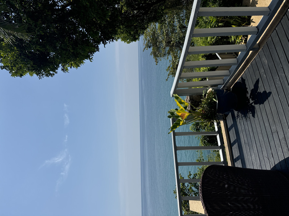 From a high vantage point, a scenic view of the ocean meets a cloud-dotted sky. A tree canopy overhangs, contrasting with the light blue expanse. A deck with a white railing hosts a potted plant, casting a shadow on the wooden surface. Wicker furniture adds a touch of comfort to the scene. The vertical perspective emphasizes the height and breadth of the ocean view.