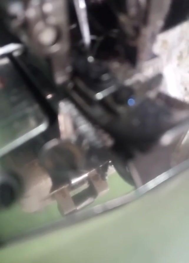 close-up of a sewing machine, specifically a serger or overlock machine. The camera initially focuses on the lower portion of the machine, highlighting the needle plate, feed dogs, and other mechanical parts. It then pans out to show the entire machine, revealing its white body with several knobs and thread spools on top. The brand name "YONGGONG" is visible on the machine. The machine sits on a green table and is surrounded by fabric and thread. The environment appears to be a small workshop or home sewing area. The machine is not actively sewing in the video.