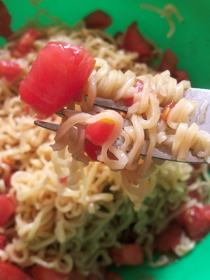 A close-up image displays a silver-colored metal fork lifting a portion of food from a bright green bowl or container. The food comprises light-colored, thin, wavy noodles and spiral-shaped pasta (fusilli) intermingled with diced red tomatoes. One large, roughly rectangular piece of red tomato is prominently speared on the tines of the fork, with smaller tomato pieces visible among the pasta and noodles on the fork and in the blurred background. The background shows an indistinct quantity of the same food within the green container. No individuals are present. The specific location within Nairobi, Kenya, cannot be ascertained from the visual elements within this image.