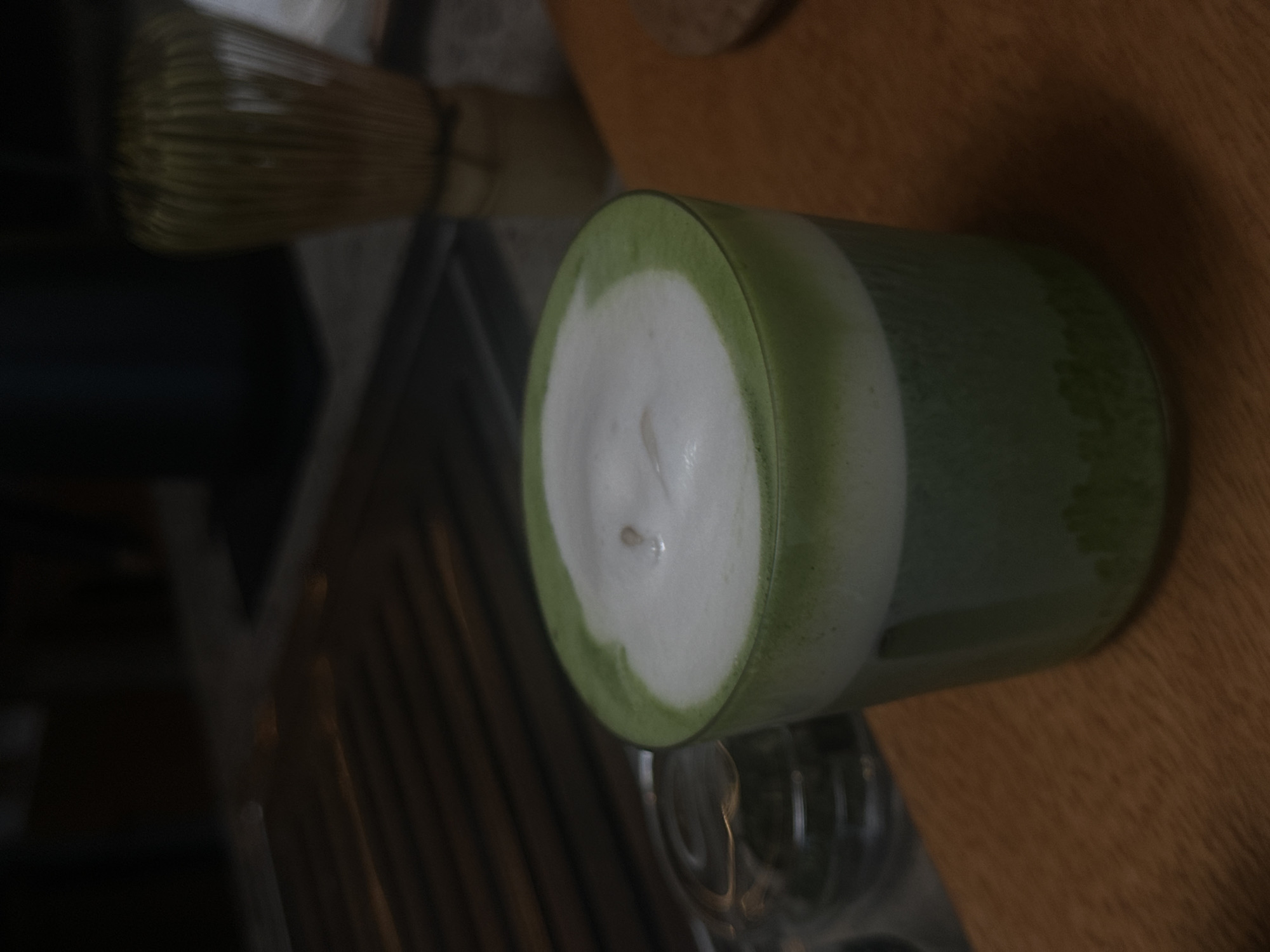 A matcha latte with a white foamy top sits on a wooden table in a cafe