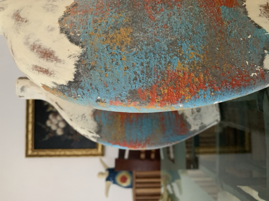The image depicts an indoor scene in Tlaxcalancingo, Mexico, featuring two decorative, tall, slender, bottle-shaped vessels in the foreground resting on a reflective, clear surface, likely a glass tabletop. The closest vessel, in sharp focus, exhibits a textured, distressed paint finish with prominent patches of bright blue, red, orange, and gray, topped with an off-white or cream section. Scattered small, reflective specks are visible on its surface. A second, similar vessel is positioned slightly behind and to the left, out of focus, displaying analogous colors and texture. In the blurred background, from left to right, a section of a dark brown wooden chair back is partially visible. Further back and to the left, a small, light-colored, stylized figurine with outstretched arms, wearing a blue top with a red and yellow circular design on its torso, stands on an unseen surface. Centered in the mid-background is a framed painting with an ornate gold frame, depicting light-colored, spherical objects (possibly berries or flowers) against a dark background. The overall background consists of a plain white wall. The scene is illuminated by bright, ambient light.