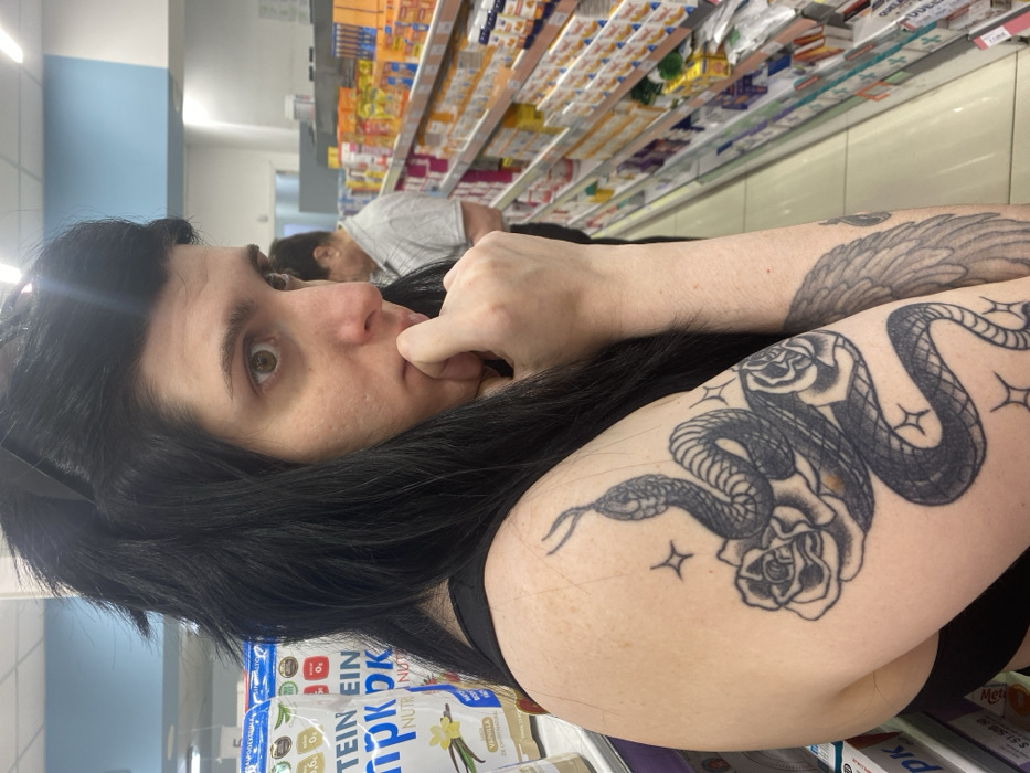 A person with dark hair is pictured in a store aisle, with shelves of various products in the background. The individual has a tattoo of a snake coiled around a rose on their upper arm, and a wing tattoo is also visible. They appear to be biting their fingernails and looking directly at the camera. Various product packages are visible in the foreground, with text and illustrations, including the words "PROTEIN" and "VAINILLA". There are also price labels visible: $51.50 and $50.50.