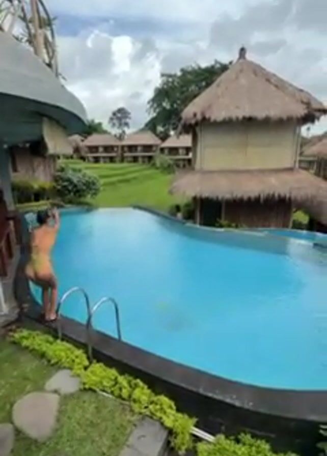 A woman in a swimsuit enters a blue, kidney-shaped swimming pool. She is standing next to a pool ladder, on a concrete edge surrounded by green grass and foliage. In the background are several thatch-roofed huts, nestled on a grassy hillside. The sky is overcast with a mix of gray and white clouds. The camera remains mostly still, capturing the woman entering the water and swimming briefly.