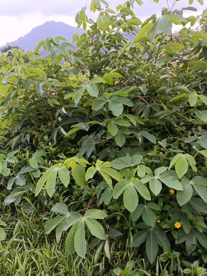 The image captures a dense natural environment, observed from a low perspective, in what appears to be the mountainous periphery of Chengdu, China. The scene is dominated by vibrant green vegetation, primarily consisting of plants with large, multi-lobed, palmate leaves, which form the midground and foreground. Smaller green foliage and occasional small, yellow, daisy-like flowers are interspersed throughout this dense growth. The lowest portion of the foreground reveals various blades of grass and other herbaceous plants. In the background, a large mountain range with indistinct features rises against a light, overcast sky. No people, animals, man-made objects, or structures are visible within the frame. There are no discernible actions or interactions occurring.