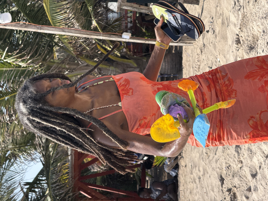 The scene is set on a sandy beach in Mopo Onijebu, Nigeria, under bright daylight. The primary subject is an adult Black woman with long, dark dreadlocks, some showing graying near the roots. Her eyes appear partially closed. She is wearing a peach-colored spaghetti strap dress adorned with a red floral pattern, a braided cream and white necklace, and a yellow wristband on her right wrist. Her skin has a glistening appearance, suggesting wetness. In her left hand, she holds a collection of colorful plastic beach toys, including yellow, blue, green, and orange shovels and molds. Her right hand carries a pair of dark blue "Quiksilver" branded flip-flops with green and yellow accents. She is walking towards the right side of the frame. The background features numerous green palm trees under a clear sky. To the left, a reddish-brown wooden structure is partially visible, and further back, a person with dark skin is seated on the sand, observing. To the right, a light-colored wooden pole stands vertically, with a small white object attached to it. The ground is consistently composed of light-brown sand.