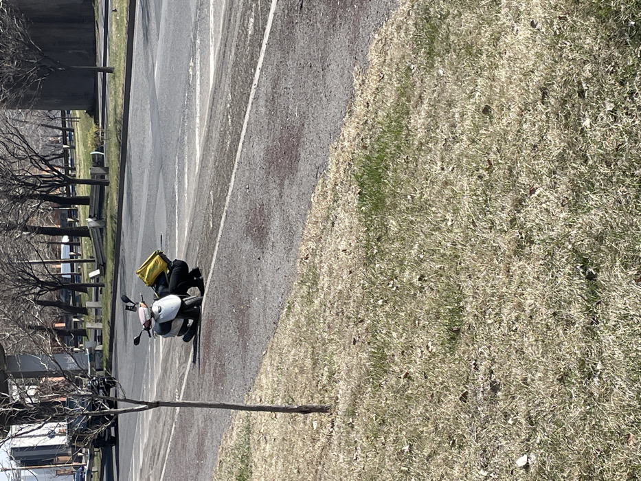 The scene depicts an outdoor daytime view in Yerevan, Armenia, during what appears to be late winter or early spring, characterized by bare deciduous trees and dry grass. A single individual is crouched on the paved shoulder of an asphalt road, positioned immediately to the right of a light-colored scooter. The individual wears dark clothing, and a rectangular, reflective gold object, consistent with a delivery container, is secured to the rear of the scooter. Their posture indicates they are attending to the scooter or an item on the ground near it. The road exhibits faint white line markings. The foreground consists of dry, light-brown grass with interspersed green patches, and a slender, leafless deciduous tree is visible on the left. The background features a line of bare trees, a dark-colored vehicle partially visible on the far left of the road, and a large concrete structure, possibly part of an overpass or industrial facility, on the far right. Direct sunlight illuminates the scene, casting discernible shadows.