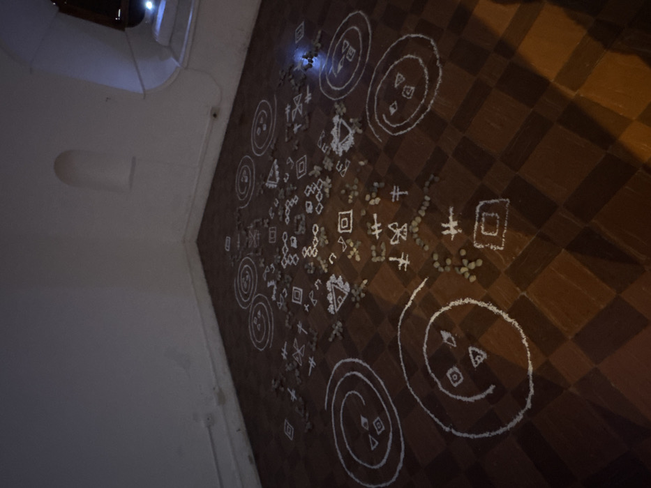 A floor displays geometric symbols drawn in white, including concentric circles, triangles, squares, and other abstract shapes. Small piles of round objects are scattered around the symbols. The floor has a checkered pattern, and the wall is light-colored with a small arched alcove. The lighting is dim, casting shadows across the room.