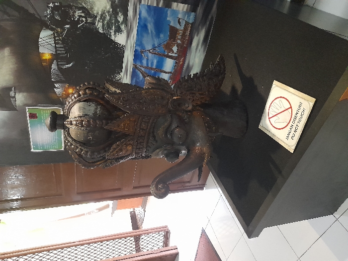 wooden sculpture of a head wearing a crown, in a museum in Kecamatan Buduran, Indonesia, located at coordinates -7.434 latitude and 112.72 longitude. The sculpture is dark brown and is on a black pedestal. The sculpture has a long, curved trunk, reminiscent of an elephant’s. There is a sign on the pedestal in front of the sculpture that reads "JANGAN DISENTUH! DO NOT TOUCH!". The sculpture is displayed in a room with white tiled floor and a wooden doorway to the left. There is a poster behind the sculpture depicting a ship at sea. The poster is partially obscured by the sculpture. The room is lit by overhead lighting. The sculpture is the subject of the image. It is not clear what the sculpture represents or its cultural significance. There are no people present in the scene.