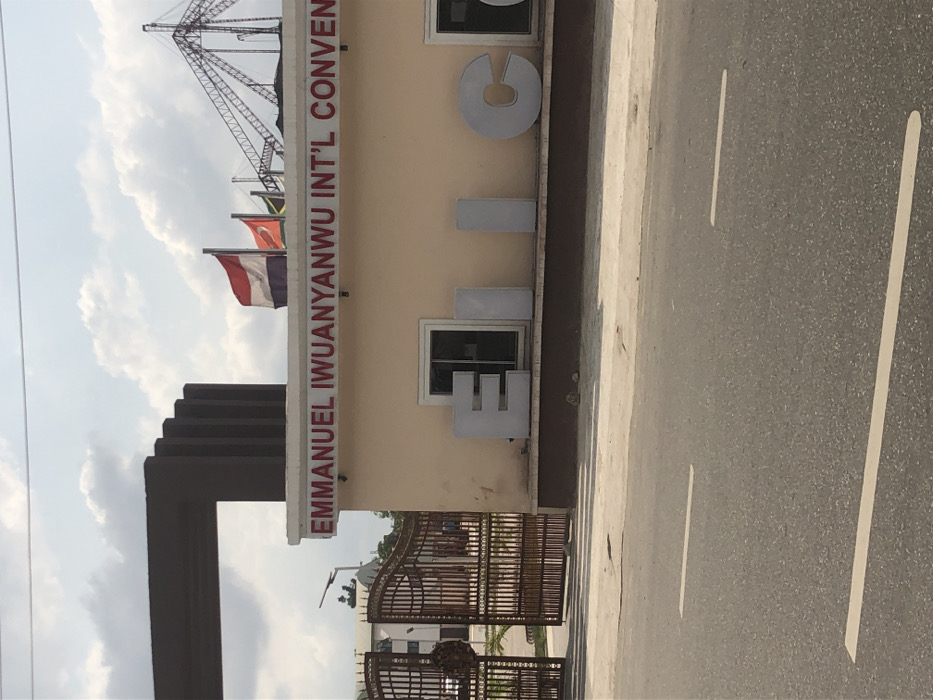 The image depicts an exterior view of the Emmanuel Iwuanyanwu International Convention Center (EIICC) located in Owerri, Imo State, Nigeria
