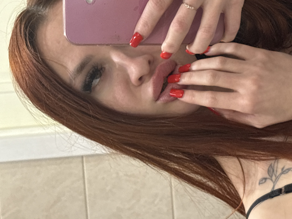 The image depicts a female individual taking a mirror selfie in an interior location within Перовское сельское поселение, Ukraine. The subject, visible from the upper chest, has long, reddish-brown hair. Her left hand, adorned with bright red, squared fingernails, touches her full, light red-colored lower lip. Her right hand holds a pink smartphone, which partially obstructs her face and reflects a segment of her image. A black garment strap is visible over her left shoulder, below which a small, leafy vine tattoo is present. The background features a light-colored tiled wall with horizontal grout lines and a vertical white trim.