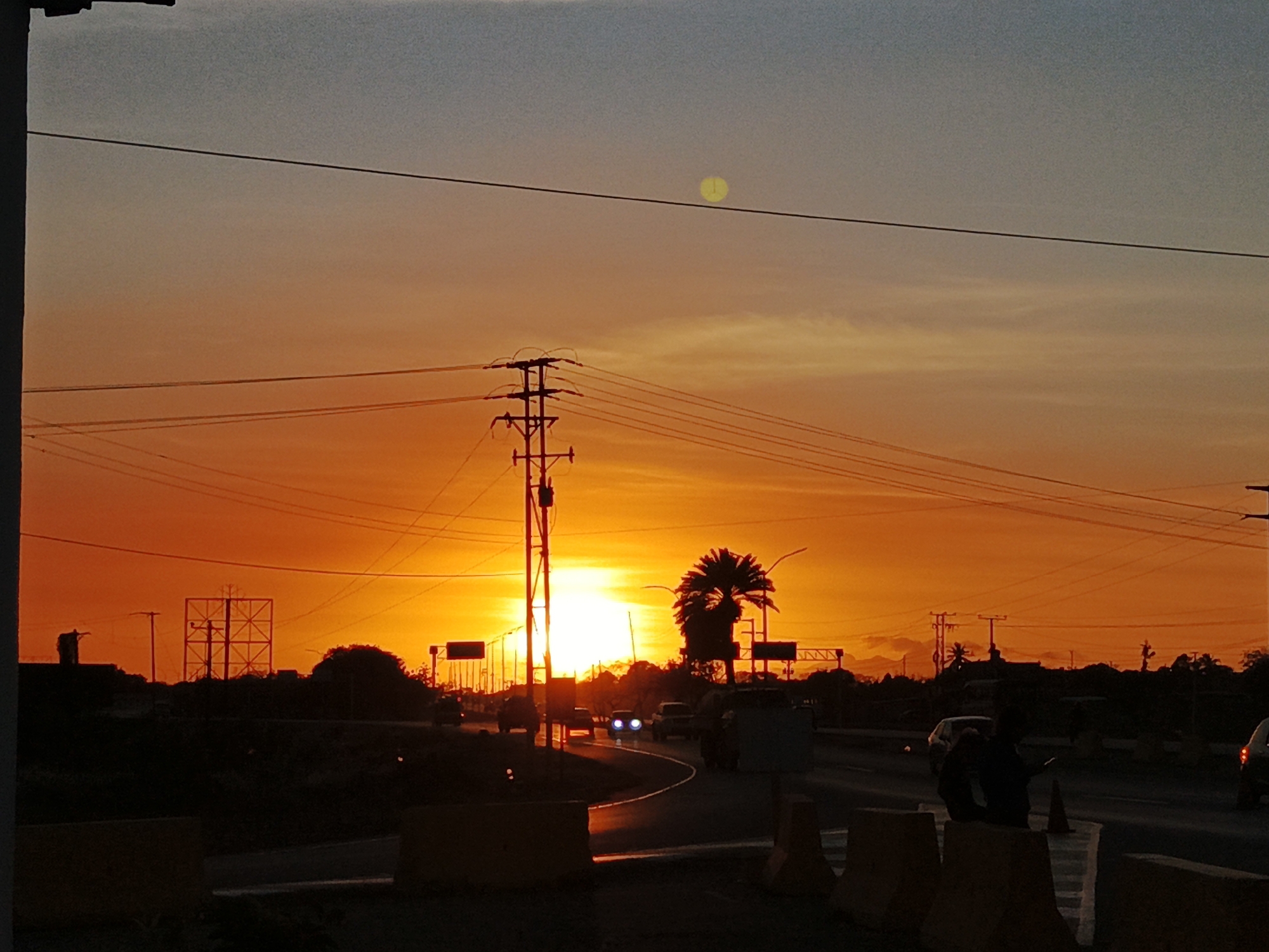 The image depicts a sunset or sunrise scene over a multi-lane roadway in El Dátil, Venezuela, viewed from a slightly elevated or roadside position