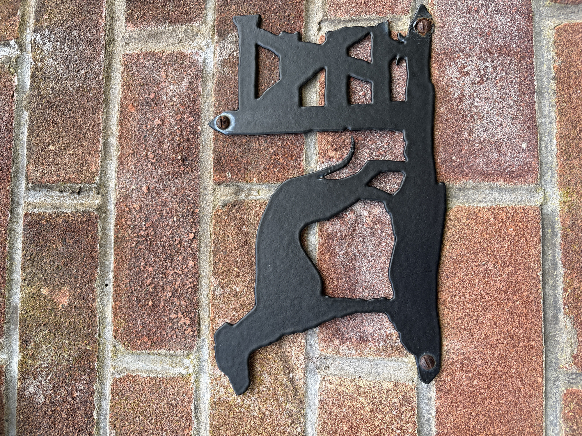 black metal silhouette mounted on a brick wall
