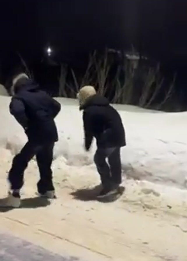Two people are wrestling on a road covered in snow, next to a pile of snow. One person appears to be pouring something on the other. The scene is outdoors at night, and there is a streetlight illuminating the area. A voice can be heard saying something in the background.