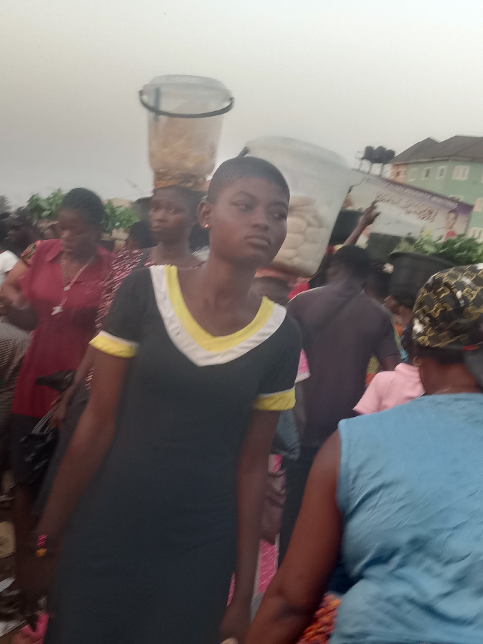 In a crowded outdoor market, a dark-skinned woman with a short haircut stands out, gazing off to the side. She wears a black dress with yellow and white trim. Other figures surround her, some carrying containers on their heads. Buildings can be seen in the background. The scene has a slightly hazy quality, perhaps due to humidity.