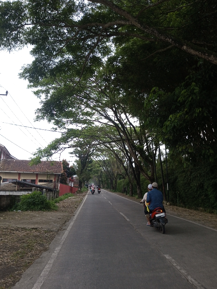 The image depicts a paved two-lane road in Sandamal Eliya, Sri Lanka, extending into the distance under an overcast sky. The road is bordered by dense green foliage, with numerous trees forming a canopy overhead. On the right side of the road, in the foreground, a dark-colored scooter with a red rear fender is observed. Two male occupants are on the scooter, viewed from the rear. The driver wears a light-colored shirt and cap. The passenger, seated behind the driver, wears a blue plaid shirt and a white cap. The scooter displays a partial license plate, "T 237". Further down the road, at least three additional motorcycles are visible, also traveling away from the viewer. To the left of the road, a two-story building with a reddish-brown tiled roof and light-colored walls is present. A lower structure with a darker roof is situated in front of it. A reddish-orange wall runs along the roadside adjacent to the building. Utility poles and overhead wires are visible against the sky on the left. The immediate ground to the left of the road consists of bare earth and sparse vegetation. The right side of the road is lined by a thick barrier of trees and undergrowth.