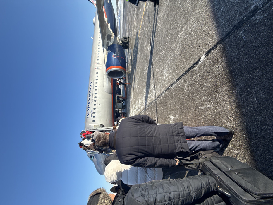 The image depicts an outdoor scene at Perm International Airport (Bolshoye Savino Airport) in Bolshoye Savino, Russia, under a clear blue sky. A silver-grey Aeroflot commercial passenger jet, with "АЭРОФЛОТ" and "Российские авиалинии" emblazoned on its fuselage, is parked on an asphalt tarmac. A mobile airstair is positioned at the aircraft's front port door, through which passengers are actively boarding. A queue of approximately ten to fifteen individuals, dressed in various winter coats and hats, is visible ascending the stairs. In the immediate foreground, several passengers are waiting to board, viewed from behind; one prominent individual wears a dark quilted coat and checkered trousers, holding a black bag, while another person's black wheeled suitcase rests on the ground beside them. At least two ground crew members in high-visibility clothing are visible near the aircraft's underside, one near the right engine, performing duties. The tarmac is dark grey asphalt, showing cracks and scattered patches of snow and ice. Distant trees, possibly snow-covered, are visible on the horizon to the right.