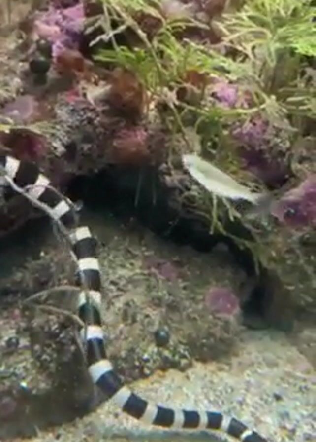black and white banded sea krait moving along the floor of a display tank in front of a rock formation covered in algae