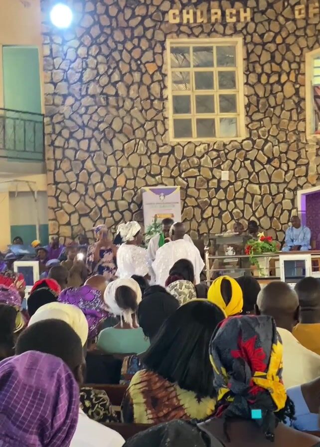 Certainly! Here's a detailed description of the video: The video shows the interior of a church with a large crowd of people seated on wooden pews. The congregation is diverse, with many wearing traditional African attire. A group of people dressed in white robes are standing at the front of the church near a banner, possibly during a ceremony or service. The building features a stone wall behind the podium, a window with a grid pattern, and a balcony. The room is well-lit with overhead lighting. Some people in the audience are taking photos or videos with their phones.