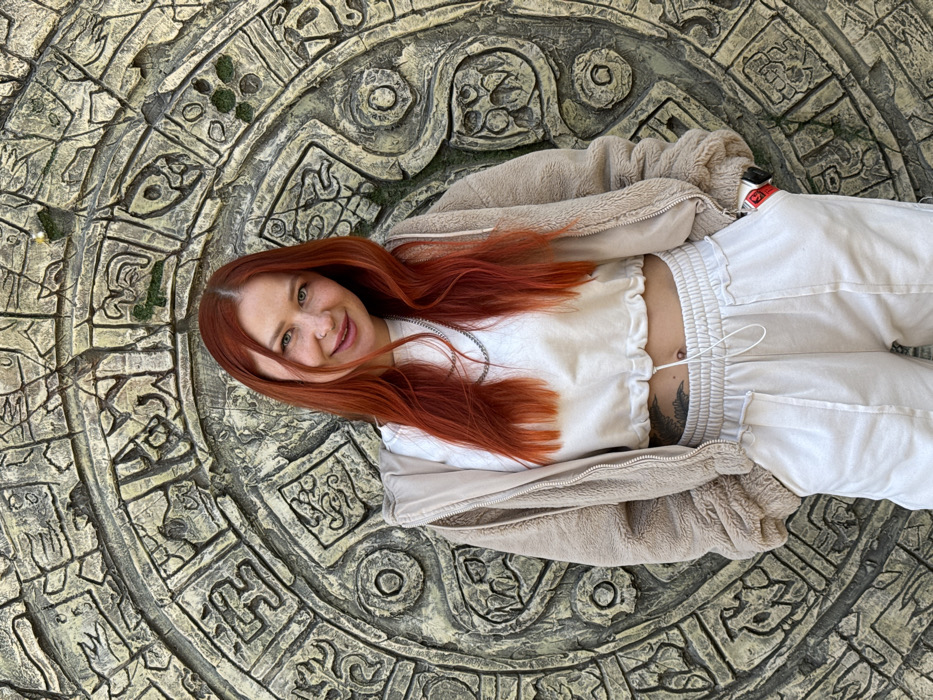 A female individual stands centered, facing forward, in front of a large, circular, carved stone relief in Shakhty, Russia. She possesses long, reddish-orange hair and freckled skin, with a light-colored stud piercing on her right nostril. A faint smile is present on her face. Her attire includes a light beige cropped sweatshirt, an unzipped light beige fleece hoodie, and matching light beige sweatpants with an elasticated drawstring waistband. A silver-colored chain necklace is visible around her neck. A dark, abstract tattoo is partially visible on her left lower abdomen. Her right hand is inserted into the pocket of her sweatpants, from which a red and white object is partially visible. The background relief exhibits concentric rings of carved, weathered glyphs and patterns, interspersed with minor green discoloration, suggesting moss or grime.