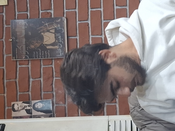 A man in a white hoodie stands angled to the right, his head tilted down. Behind him is a faux brick wall. Two album covers are attached to the wall: one featuring a singer and Arabic script, the other a split image of a man and a woman. A white radiator sits below the album covers. The man's dark hair and beard are visible, although his face is partially obscured. The lighting appears muted and diffused.