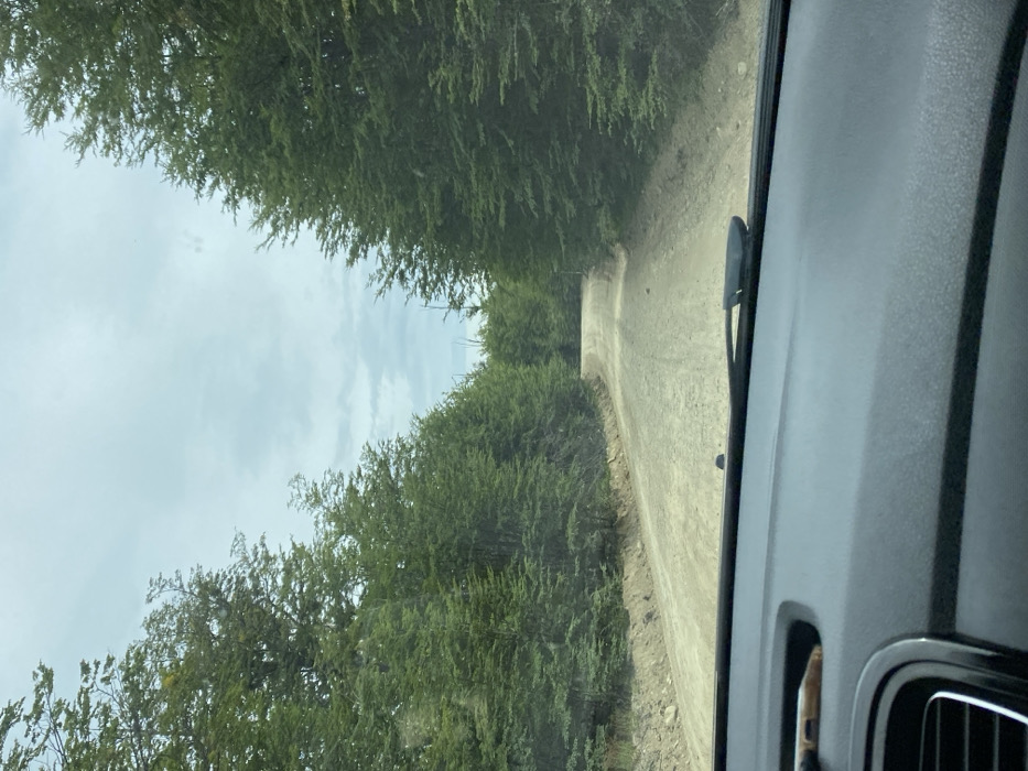 A dirt road winds between tall trees under a cloudy sky. The view is captured from inside a car, with the vehicle's dashboard visible on the right. The road appears unpaved, and the trees form a dense canopy along the path. The overall scene suggests a remote, possibly rural location.
