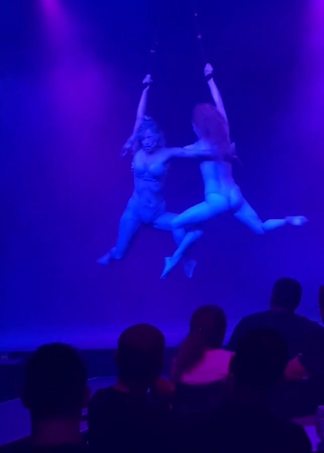 Two female aerialists perform above a seated audience. The women, dressed in matching blue bikinis, are suspended from a single point overhead, lit by blue and purple stage lights. They perform synchronized moves, hanging from the rig. The audience members are visible only from the back and are watching the performance.