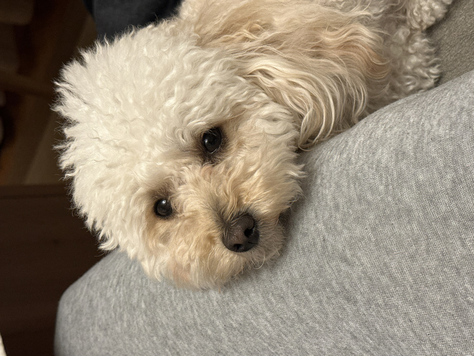 The image depicts an indoor scene located in Sofia, Bulgaria. The central subject is a small dog, consistent with a poodle or poodle mix, exhibiting light cream to blonde curly fur, dark eyes, and a black nose. The dog's head rests upon a human thigh, which is covered in light grey knit fabric, occupying the left portion of the frame. The dog's gaze is directed forward, towards the viewer. The background is dark and out of focus, indicating an undifferentiated indoor domestic environment. No other individuals or specific objects are clearly visible.