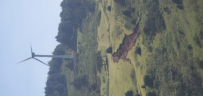 The image displays a rural landscape in Ewuaso Oonkidong'i ward, Kenya, under a clear blue sky. A white, three-bladed wind turbine stands on a distant, tree-covered hill in the upper background. The mid-ground features a predominantly green, undulating terrain. A significant, winding erosion gully with exposed reddish-brown soil cuts through this green area, extending from the upper left quadrant downwards and towards the right. Multiple narrow dirt paths are discernible within the landscape. A single human figure is observed walking on the green ground to the left of the erosion gully. The foreground is comprised of dense green vegetation.