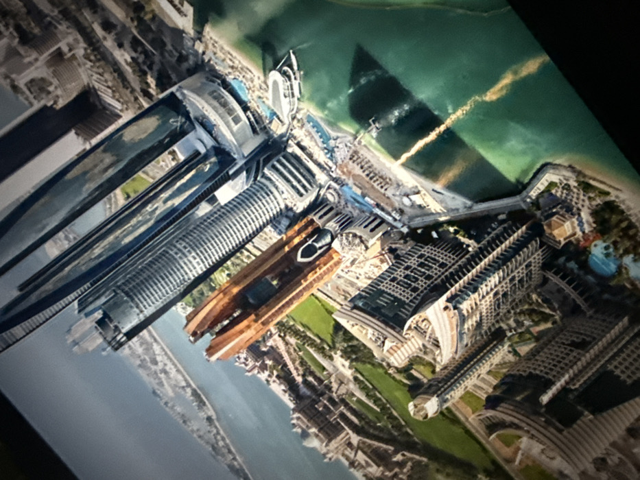 A high-angle aerial view depicts a densely developed urban coastal landscape, observed in what is stated as the city of Plovdiv, Bulgaria. The scene is dominated by numerous modern high-rise buildings and skyscrapers situated along a light blue-green body of water. Prominent structures include a cluster of three tall, slender glass towers with reflective facades, two distinctive bronze-colored angular towers featuring unique architectural elements, and a large, ornate palatial building surrounded by extensive manicured green lawns and gardens. Several other multi-story residential or hotel complexes with intricate designs and terraced sections are also visible. The coastline features sandy areas, multiple piers or jetties extending into the water, and numerous outdoor swimming pools integrated into the building complexes. Shadows cast by the tall structures suggest a clear sky and direct sunlight. No individual people or specific actions are discernible due to the elevated perspective.
